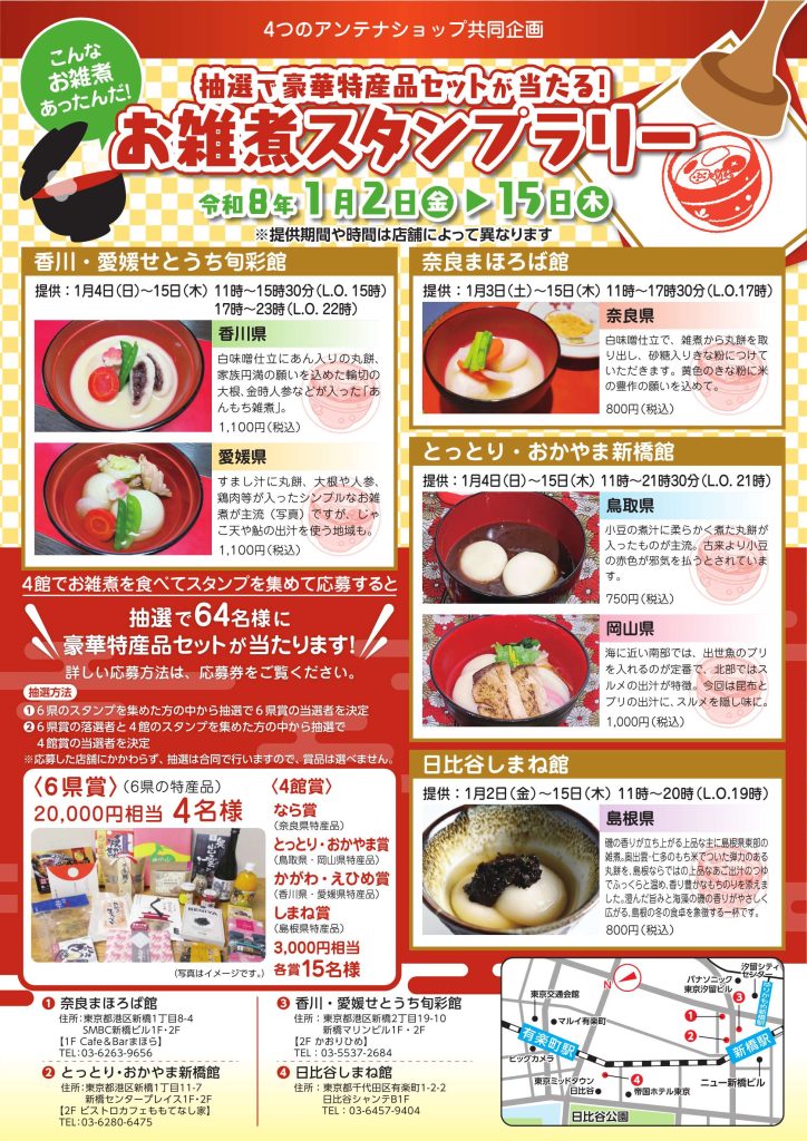 アンテナショップ「奈良まほろば館」、「とっとり・おかやま新橋館」、「香川・愛媛せとうち旬彩館」、「日比谷しまね館」では、共同企画としてご当地のお雑煮を味わえるスタンプラリーを開催します。スタンプを集めて応募すると、抽選で豪華な特産品セットが当たります。年始めはアンテナショップで、ご当地の味覚を楽しみませんか。